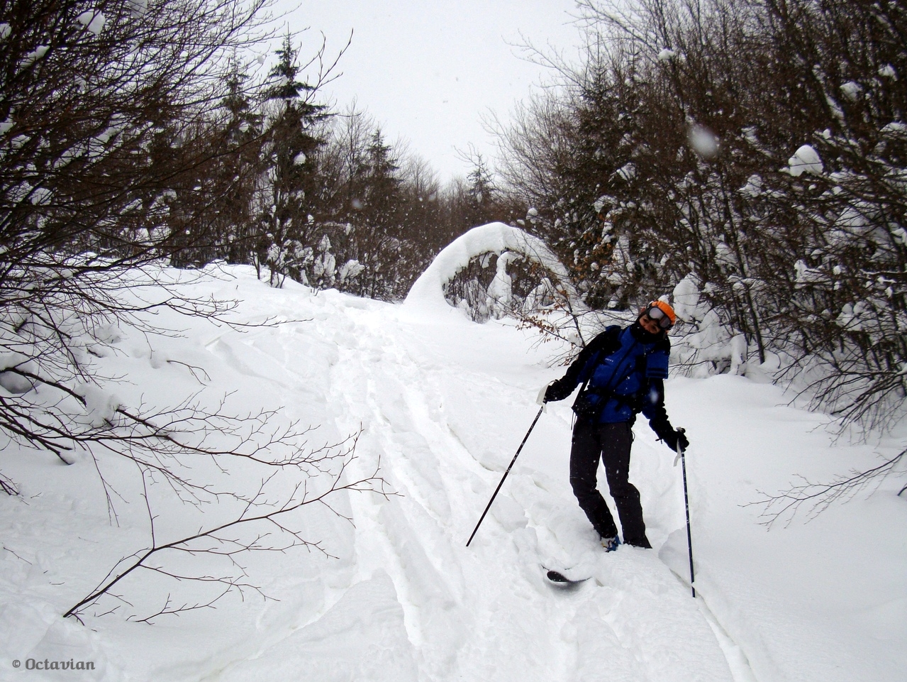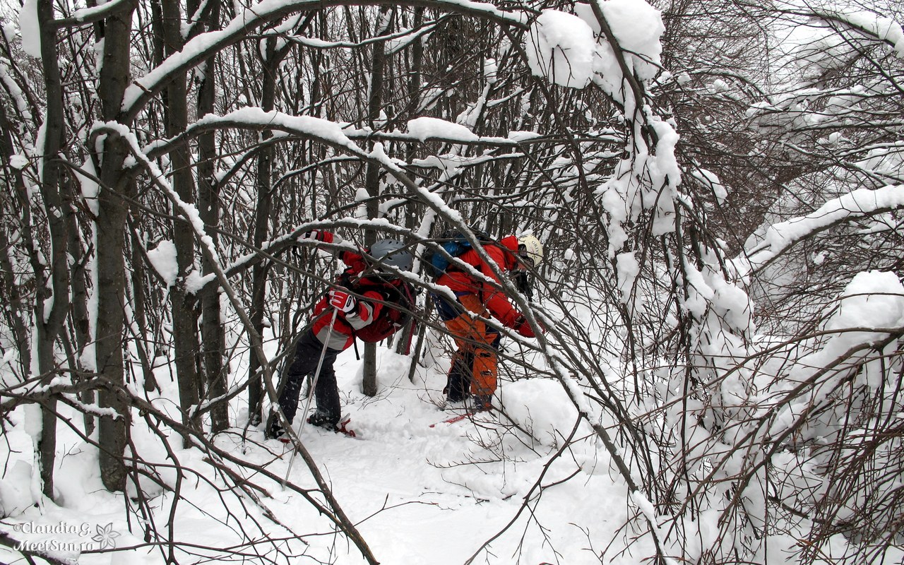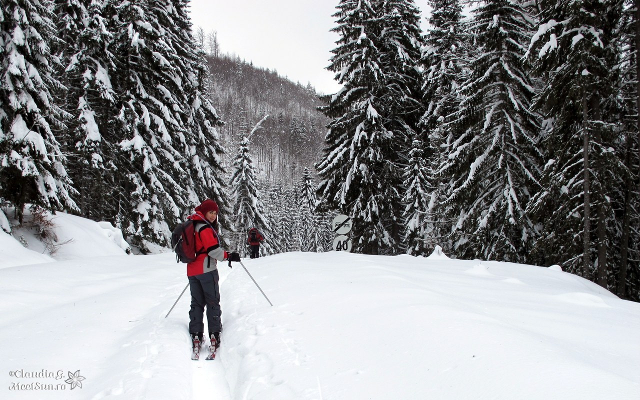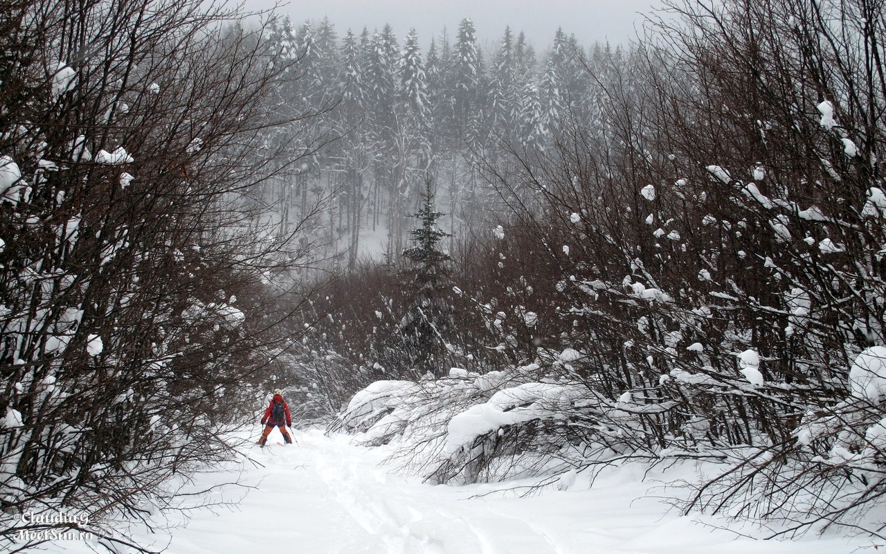 drumul continuă cu trecere în județul Gorj, noi intrăm pe un drumeag (de pe vremea defrișărilor probabil) având calea deschisă de niște frumoase urme de schiuri – coborârea unor adevărați judecând după paralelismul constant