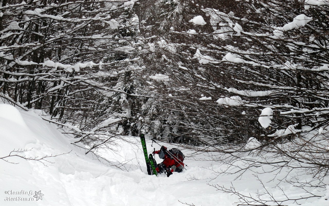 Momentul cu datul la vale nu era și cel mai așteptat de mine. Aveam în minte ziua precedentă la Straja când m-am descurcat binișor doar că atunci am fost ajutată de ceață și nu vedeam nimic și pare mai simplu să abordezi „problema” din aproape în aproape. În plus zăpada nu avea nici un strat de crustă pe care să te sprijini când virezi. Nu mă gândeam că mă voi lovi la o cădere ci că n-o să mă mai pot ridica.