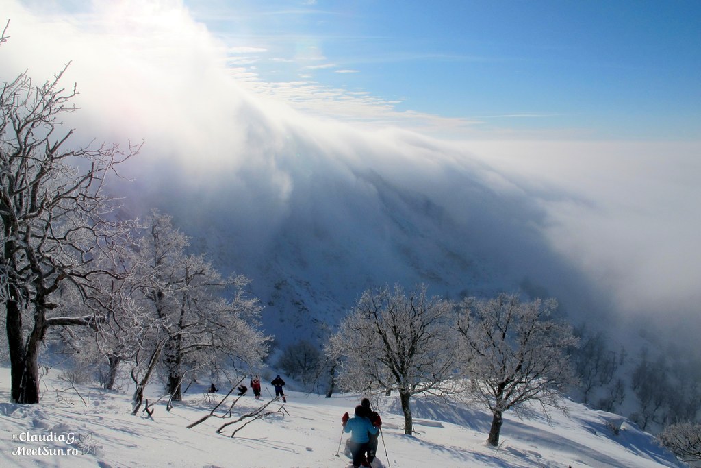 De obicei acesta e momentul turei când ești complet mulțumit de cele văzute și întâmplate. Nu cred că greșesc când presupun că nimeni nu se aștepta să fie și mai frumos decât era deja. În starea asta ne-a surprins norul ce se revărsa ca o cascadă de undeva de deasupra Vârfului Ghinalțu ca venind de după o culme imaginară, spectacolul de acest fel al norilor fiind frecvent în munții înalți – noi am prins locuri în rândul din față. Parcă știa Măcinul că jinduisem la o primă tură a lui 2015 pe munte și mi-a arătat cât e el de munte. Asta în timp ce înotam prin zăpadă până la genunchi sau până la brâu – fiecare după cum îi pășea norocul.