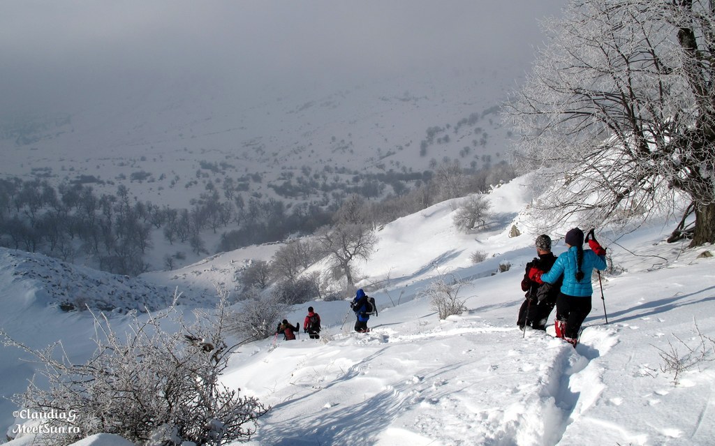 După episodul cu ospățul altfel ne-am înfipt în coasta muntelui. Am ajuns din urmă un grup de drumeți, constănțeni veniți la muntele lor, și până în Șaua Țuțuiatu i-am lăsat să bată poteca prin zăpada de 30-50 cm deja. Că așa-i la munte iarna, dacă prinzi pe careva să-ți „bată urme” nu-l deranjezi cu depășitul. În șa am făcut un nou popas la Izvorul Italienilor alături de poveștile de pe vremea când pinguinii au pus umărul la refacerea lui.
