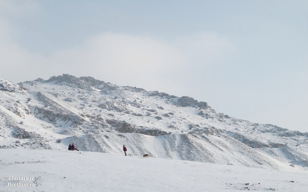 Am răzbit prin sat (se urmează marcajul triunghi albastru) chiar dacă drumurile erau puțin deszăpezite și am parcat, nesperat de bine, chiar la ultima casă. Am început să urcăm pe o vreme închisă, calmă, cu un nor ce părea că acoperă de când lumea culmea golașă a Măcinului, culme ca o ridicătură cu țepi de sub crusta câmpiei. La o tură de genul ăsta cu gașca nu prea contează oricum vremea cât timp ne-auzim unii cu alții.